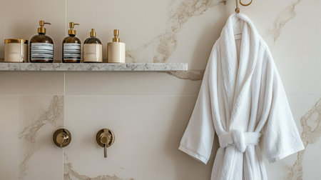 Immaculately pressed hotel robe hanging on velvet hanger, luxury toiletries arranged on marble shelf, five-star elegance