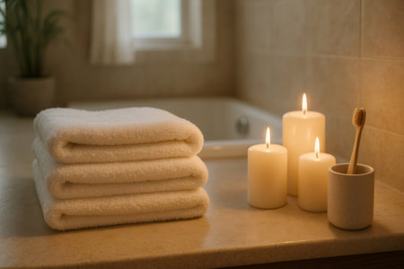 Elegant bathroom setup with towels, plants, and candles for a relaxing atmosphere