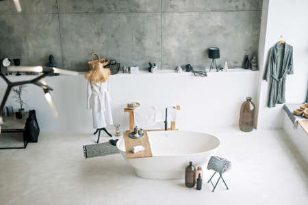 Element of white comfortable bath in modern house with contemporary interior design. Home decor, clean dry towels and bathrobe in apartment with bright bathroom