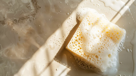 Top view of white sponge with soft soap foam on light kitchen backdrop. Housekeeping aesthetic concept. Generative AI.