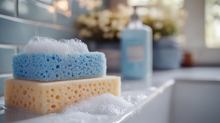 Bright sponges in vibrant colors sit atop a shiny surface, surrounded by playful bubbles and foam, creating a lively and clean atmosphere ideal for household themes.