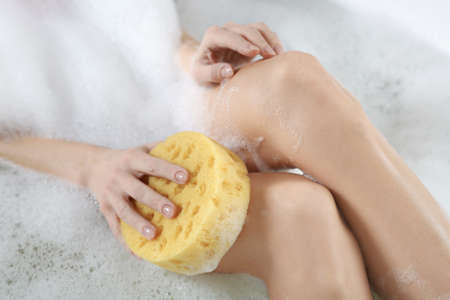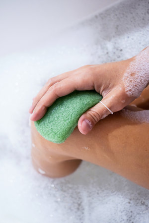Woman washing legs with konjac sponge in bathroom, close up. Zero waste product.