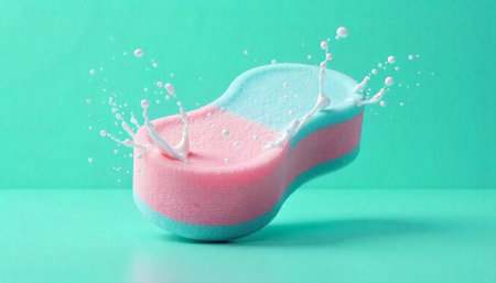 A vibrant arrangement of colorful sponges set against a pastel blue and pink background. Water droplets and bubbles enhance the freshness and cleanliness vibe.