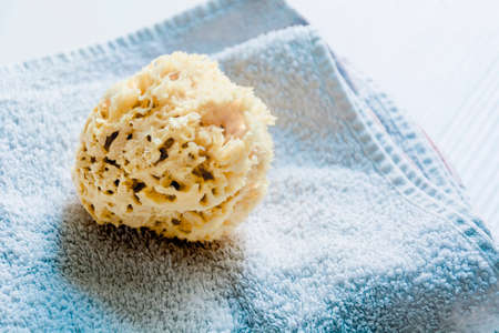 A natural yellow sponge on towels stacked on a white wooden table. Personal care and hygiene. Bath and relax