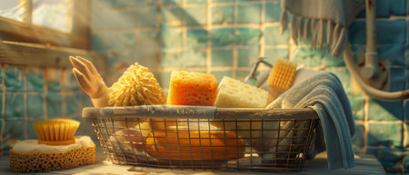 A vibrant scene featuring a yellow sponge resting in a bowl filled with soap bubbles and water, highlighting themes of cleanliness and simplicity in everyday life.