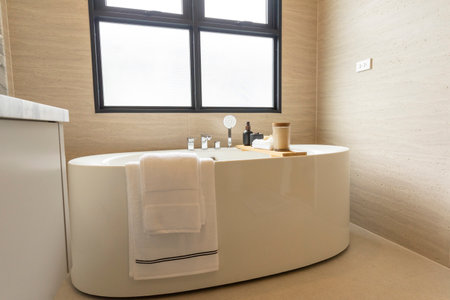 Interior of a modern bathroom with a white bathtub and a towel