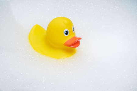 Yellow duckling is bathing in bubble bath