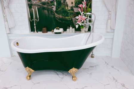 Beautiful luxury vintage empty bathtub near big window in bathroom interio, free space. Freestanding white bath. The bathroom is beautifully decorated with marble tiles.