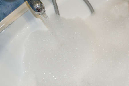 Pouring water to bath with big white foam