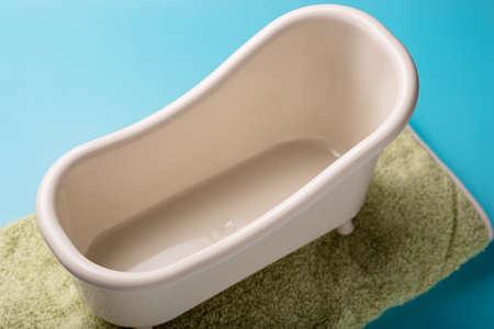 Miniature plastic bath on a blue background
