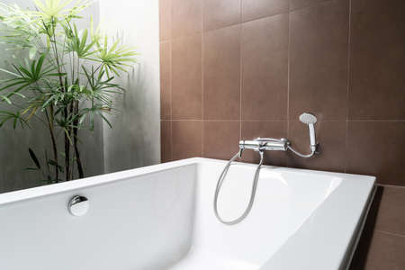 Modern tap and white ceramic bathtub bathroom with wall lamp interior building decoration, concept bathroom contemporary