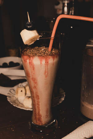 Protein cocktail with milk, vanilla in a glass jar with straws. Sports nutrition