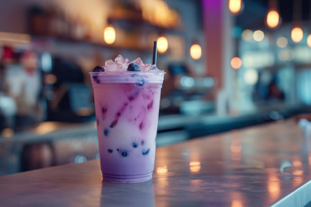 Iced purple drink taro iced milk tea in a clear cup on a bar, with a blurred background