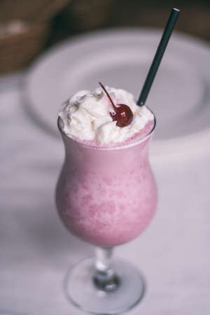 Partially blurred glass with berry milkshake with straw, whipped cream and cocktail cherry, on wooden table with white tablecloth. Vertical