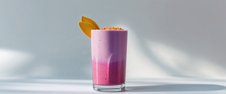 A glass of a smoothie with fruit in it sitting on the table, AI