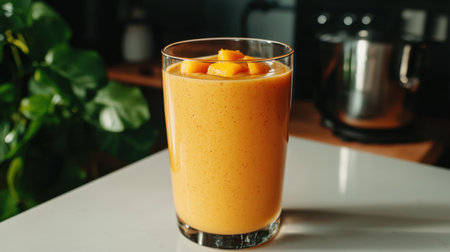 Refreshing Mango Smoothie in a Glass with Topped Fruit Against a Cozy Kitchen Background Ideal for Healthy Living and Beverage Promotion