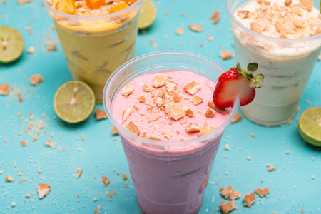 Strawberry, mango and lemon charlotte in plastic cups on light blue background.
