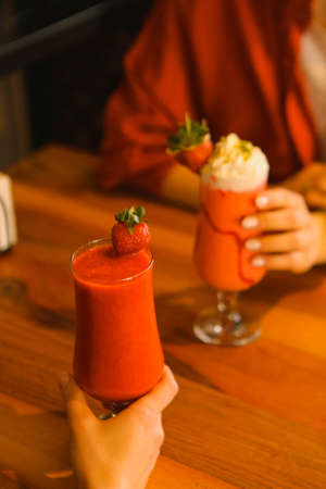 Fresh strawberry juice in female hands, closeup. Healthy lifestyle.