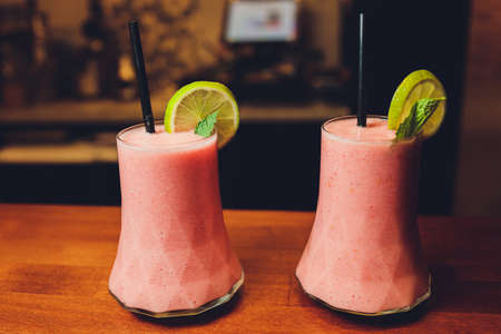 Cocktail on the bar in the restaurant. Cocktail decorated with lemon, space for text. Photo for the menu.