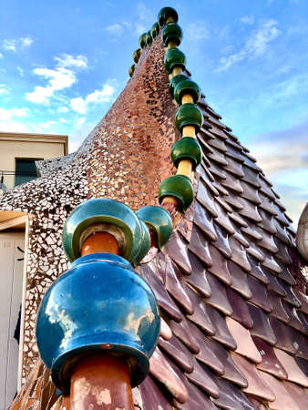 Barcelona - September 19, 2014: Rooftop of the house Casa Batllo - House of Bones designed by Antoni Gaudi. Ceramic tiles, with tower and bulb. Dragon's spine roof arch. Barcelona, Spain.