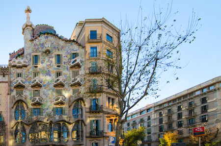 BARCELONA - MAY 01: The facade of the house Casa Battlo (also known as the house of bones) designed by Antoni Gaudi in his famous expressionistic style on May 01, 2015 Barcelona, Spain