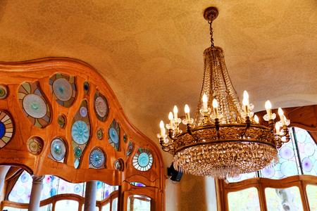 Barcelona, Spain - 30 July 2020: Casa Batllo Ceiling and chandelier close-up,