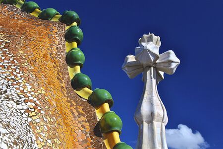 White cross with mosaic domed roof of Casa Batllo