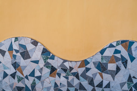 Wall decorated with ornamental waves of trencadis, also known as broken tile mosaics