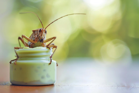 Large grasshopper is standing on a jar of organic cosmetic cream, eating the contents