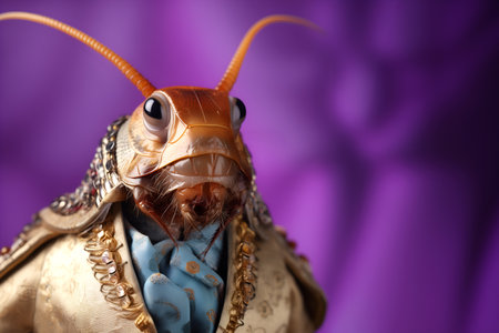 Creative animal concept. Cockroach pest insect in glam fashionable couture high end outfits isolated on bright background advertisement, copy space. birthday party invite invitatio