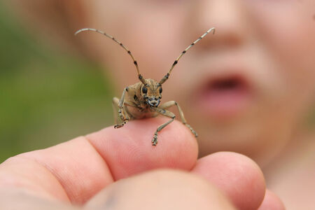 Hand holding a beetle with a child face on background