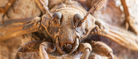 A detailed view of a unique insect, emphasizing its intricate textures, colors, and striking features against a dark backdrop.