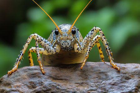 A vibrant insect rests on a rock showcasing its detailed features and colors in a lush green environment during daylight.