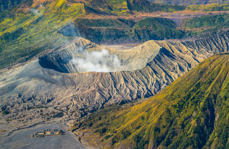 Aerial view of the crater of an active volcano emitting gas and fumes (Mount Bromo, Java)