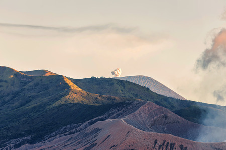 Mount Bromo volcano Gunung Bromo in Bromo Tengger Semeru National Park, East Java, Indonesia. Sunrise with soft light and smoke. Semeru eruption in background.