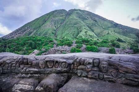 Stone heads carved in the rock near the volcano bromo