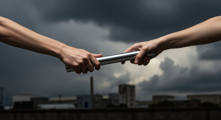 Two hands passing a silver relay baton against a dramatic cloudy sky and city buildings. Symbolizes teamwork, coordination, and the transition of responsibility.