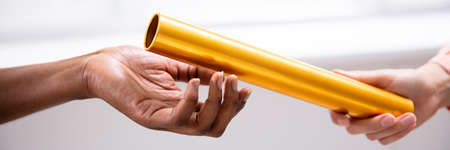 Close-up Of A Hand Passing Golden Relay Baton To African Woman's Hand