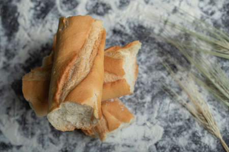 Top view of Freshly baked baguette slices on white background