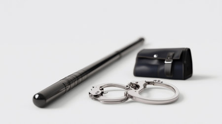 A collection of police equipment, including handcuffs, a baton, and a holster, arranged on a clean white surface.