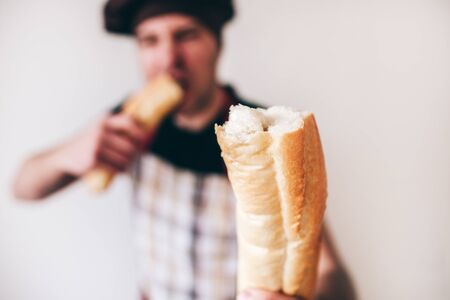 Funny fat guy on a diet. Happy man with baguettes.
