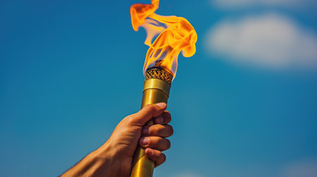 A man's hand holds a torch with the Olympic flame against a blue sky background. Concept of the Paris 2024 Olympic Games