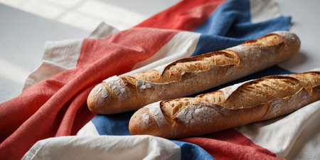 AI Generated. Crusty Artisan Baguettes on Red White Blue Fabric