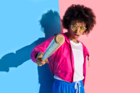 Young angry african american girl pointing in camera with baseball bat on pink and blue background