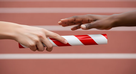 A close-up of a relay race baton pass. One athlete's hand is passing a red and white striped baton to the outstretched hand of a teammate. The background is the blurred red lines of a running track.