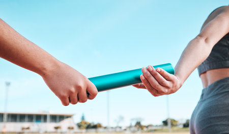Person, team and hands with baton in relay, running marathon or sports fitness on stadium track. Closeup of people holding bar in competitive race, sprint or coordination in teamwork performance
