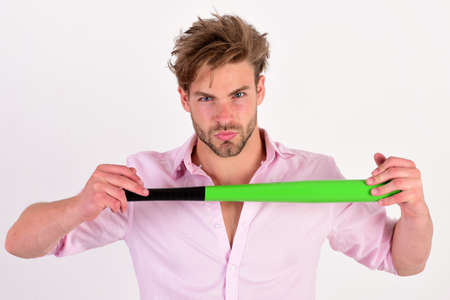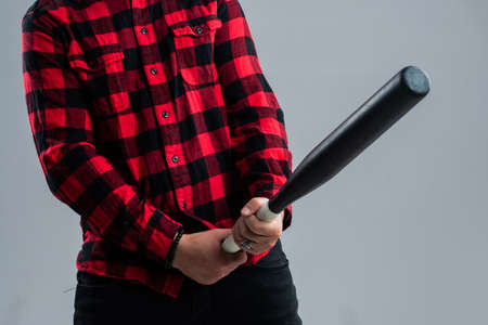 A young man is holding a wooden bat. Bouncer, security guard, bodyguard concept. A large man in a T-shirt looks at the camera.
