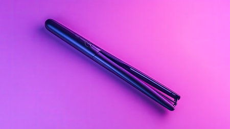 A professional-grade hair straightener and curling iron resting diagonally on a gradient purple background.