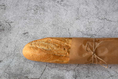 Baguette bread, french stick, wrapped in brown paper tied with string. Recycle packaging concept