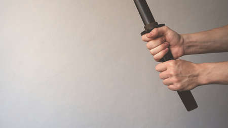 Male hands hold a katana on a gray background. A Kendo warrior with shinai in hands, preparing for kendo competitions. Space for text. Mockup.